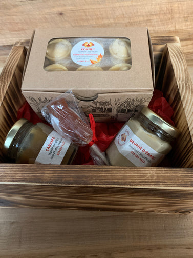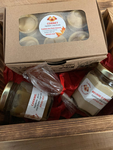 Comprend notre caramel à l’érable, beurre d’érable, 6 cornets de tire et beurre d’érable. Pour compléter le tout un suçon à l’érable .