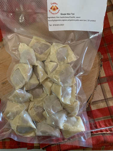 Ingrédient: Porc haché, boeuf haché, sauce soya, ail, gingembre, oignon, sel, poivre, pâte won tond ( 20 unités)